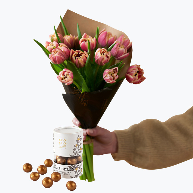 Gavepakken fylt med vakre, doble tulipaner fra den norske gartneren! Disse er et vidunderlig syn når de åpner seg. Overrask din utvalgte eller en du er glad i, og send Kjærlighetstulipaner levert på døren. Leveres med deilige lakris kuler med smak av salt lakris og hvit sjokolade.